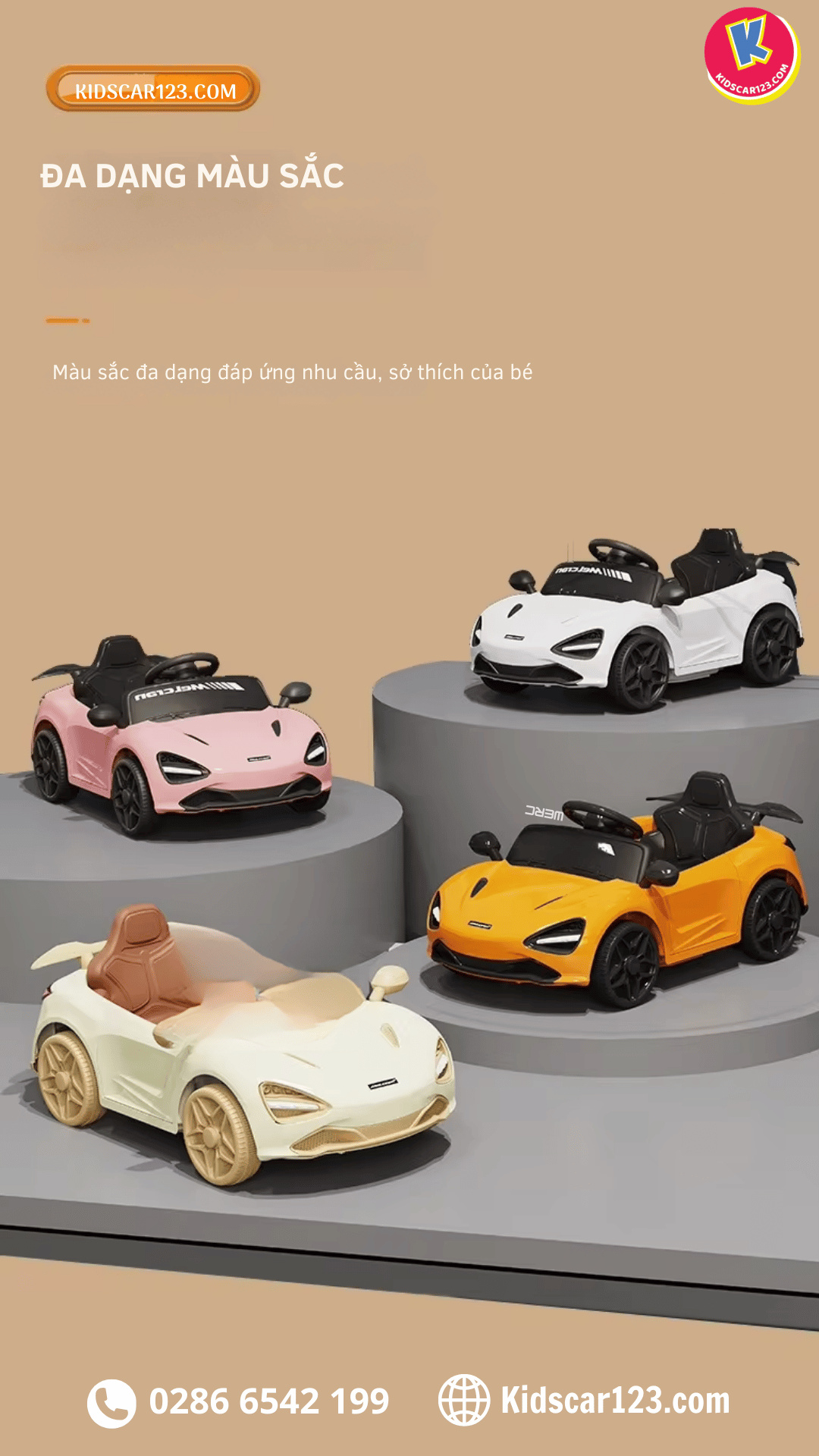 Ô tô điện trẻ em Mclaren BPD-720 kiểu dáng thể thao, được thiết kế ngoại thất giống đến 99 % phiên bản thật và được phía Mclaren đồng ý cấp phép sản xuất và gắn logo, thích hợp cho bé nhỏ dưới 35 kí, xe hoạt động tốt nhất với bé 18-30kg, hoặc từ 6 tháng đến 5 tuổi, có dây an toàn, có điều khiển từ xa cho bố mẹ, và chế độ tự lái cho bé, nổi bật hơn với bản điều khiển cảm ứng.