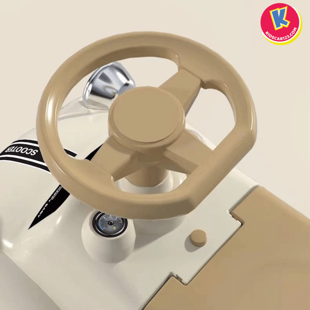 - Màu sắc trang nhã: Tone màu chủ đạo là Kem, kết hợp với ghế ngồi và vô lăng màu nâu nhạt. Đây là bảng màu theo phong cách tối giản, Hàn Quốc (minimalist), rất dễ phối với nội thất hiện đại và chụp ảnh "sống ảo" cho bé.