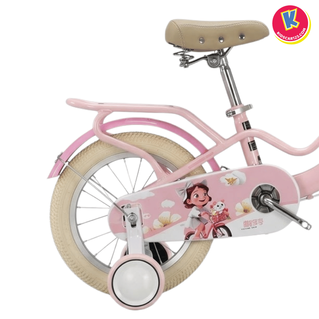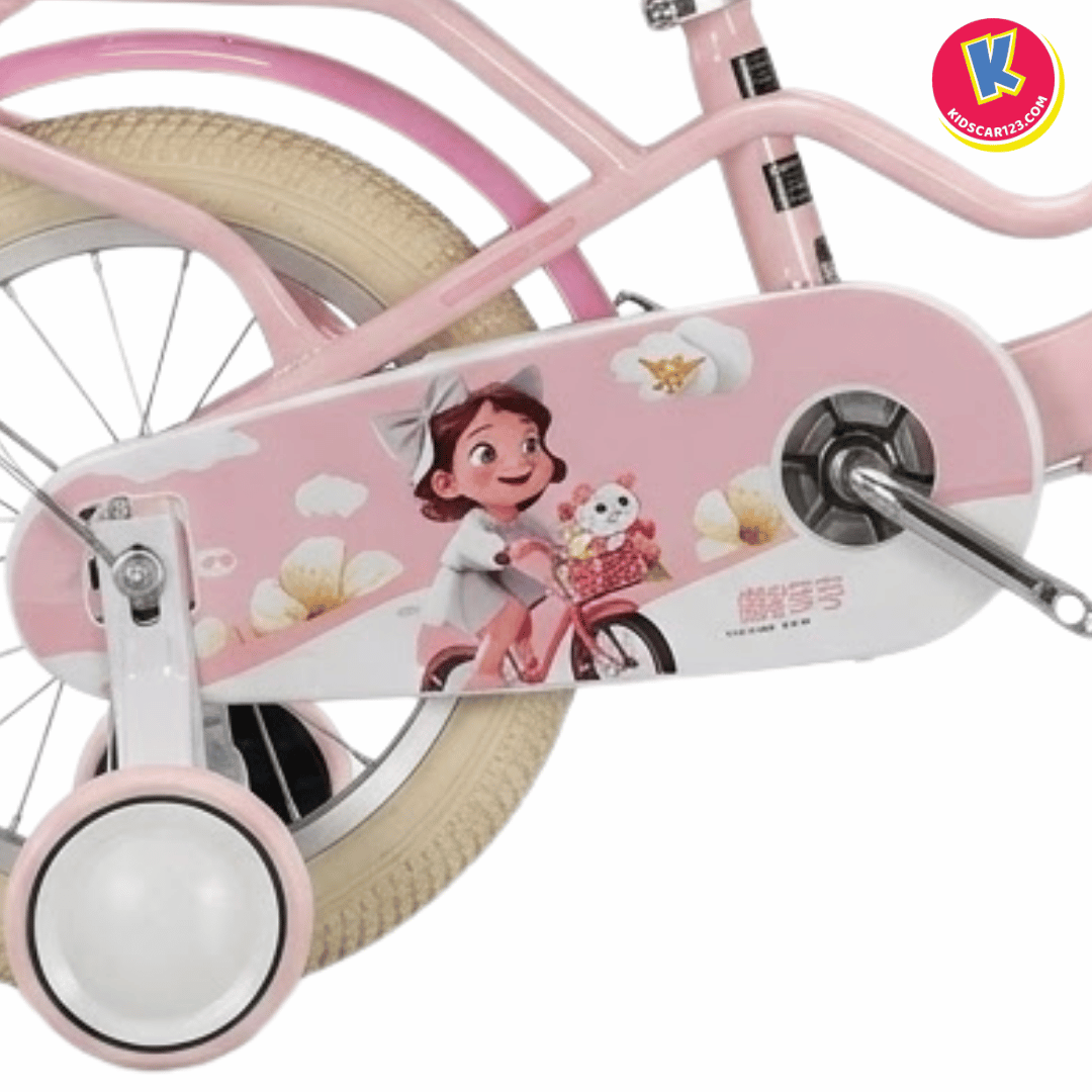 Hệ thống hộp xích kín toàn diện: Đây là chi tiết cực kỳ quan trọng. Toàn bộ dây xích được bọc trong một hộp bảo vệ in họa tiết hoạt hình bé gái và chú mèo đáng yêu. Hộp xích kín giúp ngăn chặn tuyệt đối tình trạng gấu quần hay chân bé bị kẹt vào xích, đồng thời giữ cho xe luôn sạch sẽ, dễ vệ sinh.