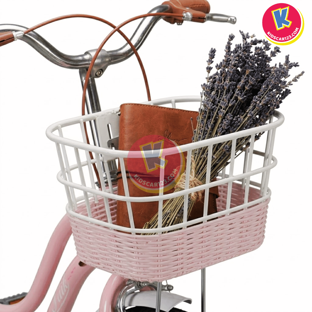 Phụ kiện đồng bộ: Xe trang bị sẵn chiếc giỏ nhựa giả mây/thép trắng phía trước xinh xắn để bé đựng cặp sách, và gác baga sau có đệm bọc da êm ái để chở thêm bạn bè.