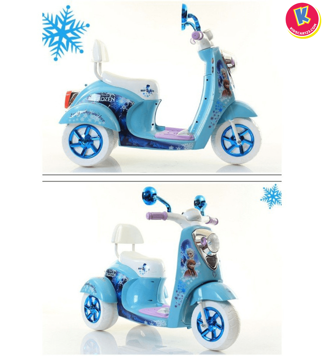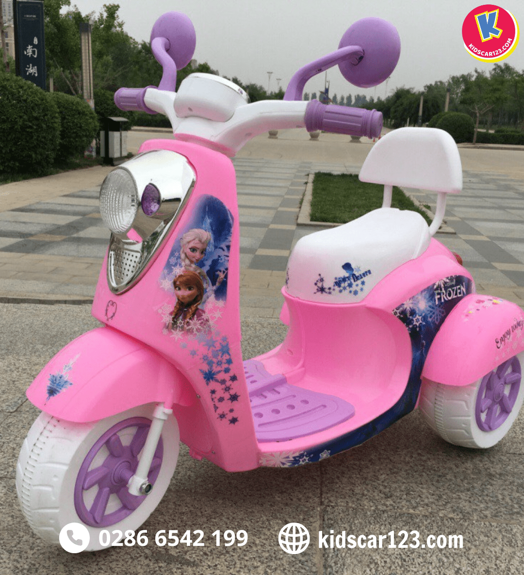 Xe máy điện qm-168 cho bé được thiết kế với kiểu dáng Vespa được trang trí hình búp bê Elsa và Anna kèm theo đó là những bông hoa tuyết vô cùng đẹp mắt