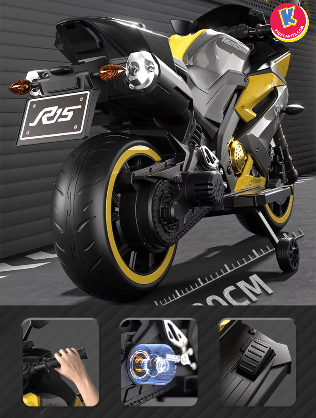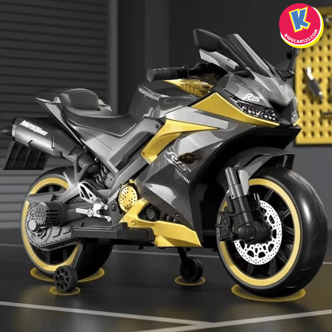 Hình 5: Xe Mô Tô Điện Trẻ Em R15 Dáng Thể Thao Màu Xám Phối Vàng