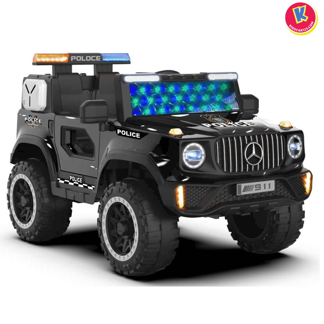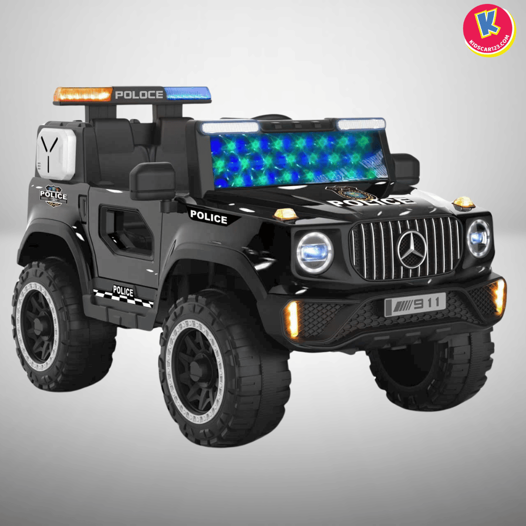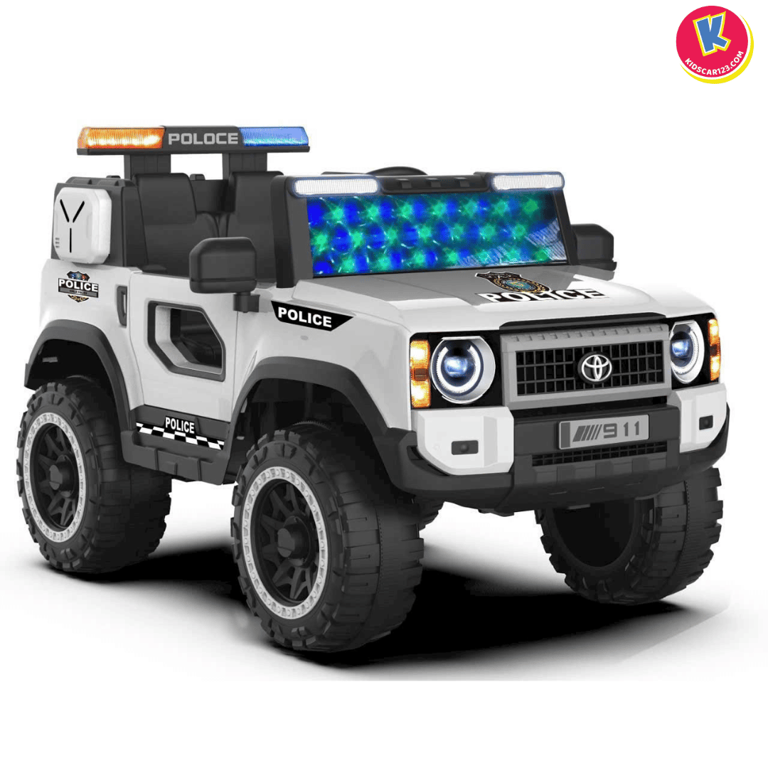Cụm đèn ưu tiên trên nóc xe (xanh/đỏ) kèm chữ "POLOCE" – bé thỏa sức "tuần tra" như cảnh sát thực thụ.