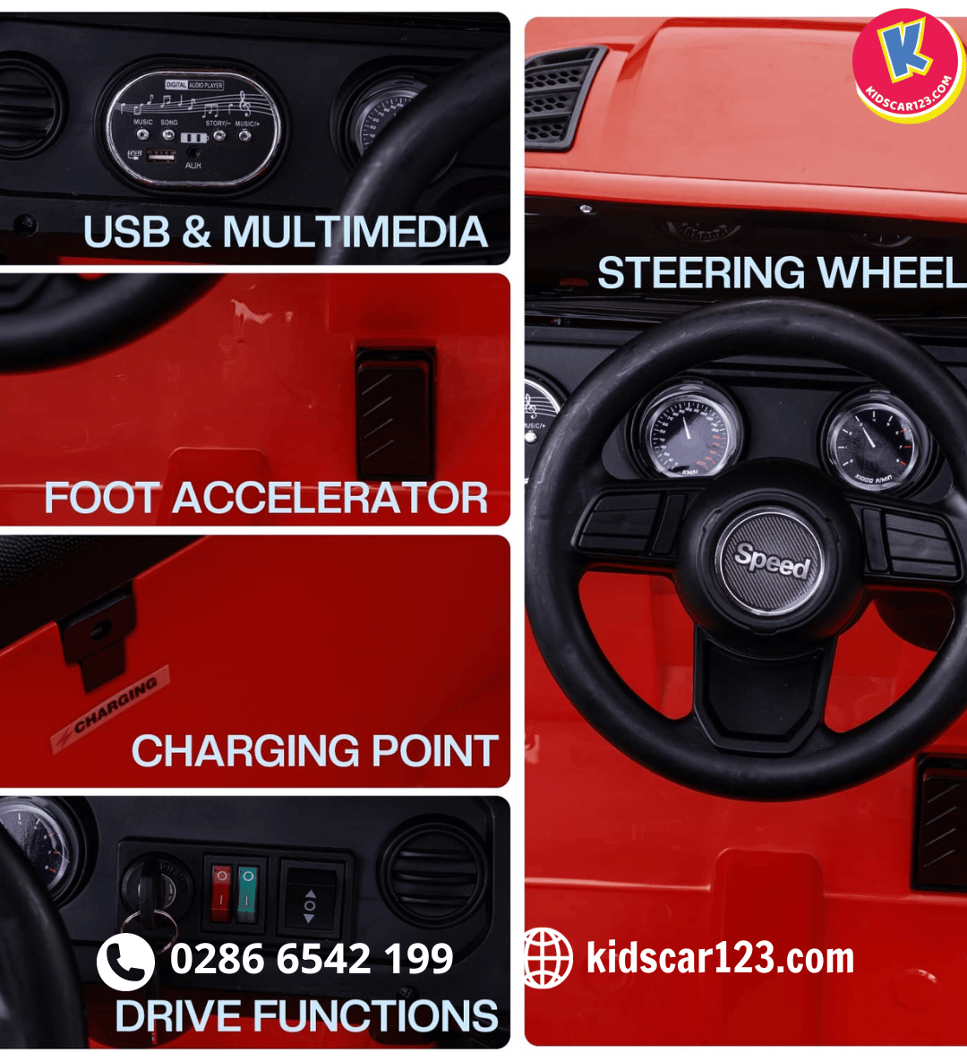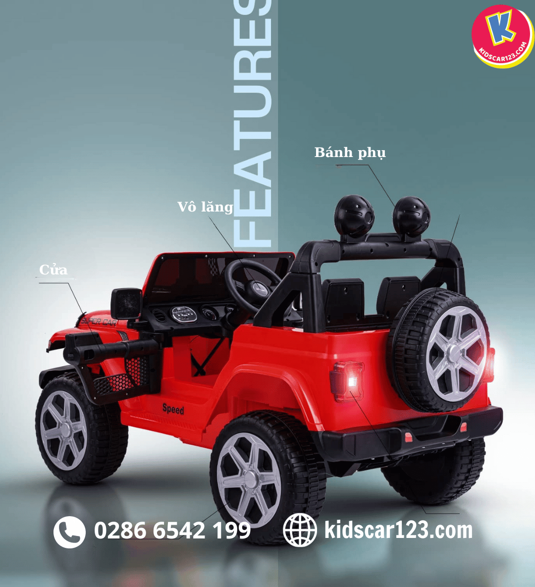 - Thiết kế mạnh mẽ, hầm hố, mang đậm chất địa hình: Xe được thiết kế theo phong cách mạnh mẽ, hầm hố, với những đường nét góc cạnh, mang đậm chất địa hình. Xe có kích thước lớn, phù hợp với vóc dáng của trẻ em.