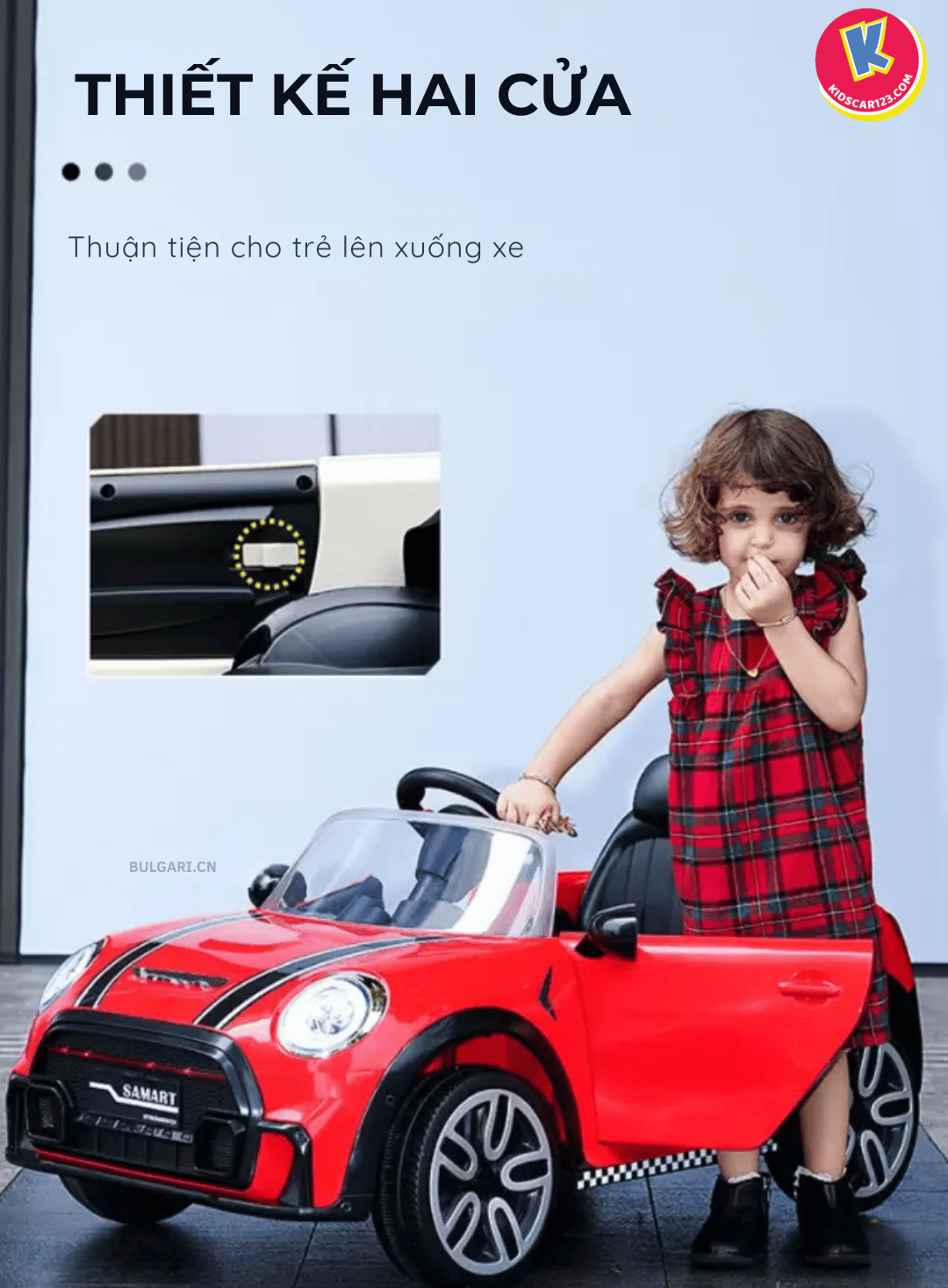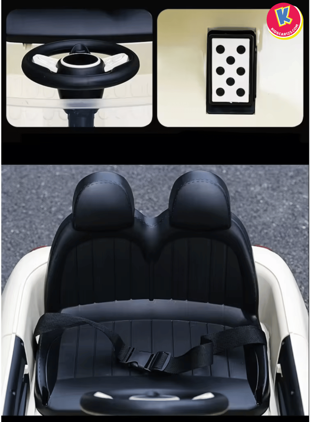 Không gian chỗ ngồi rộng rãi với ghế ngồi bằng da êm ái, kèm dây cài an toàn cho bé, đặc biệt là 2 cánh cửa mở ngang sành điệu, bé cũng dễ dàng trong việc lên xuống xe.