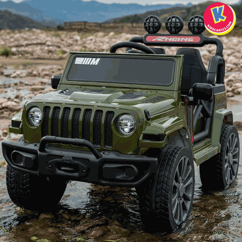 Mỗi đường nét đều mô phỏng nguyên bản xe địa hình với khung gầm chắc chắn, logo ngôi sao ba cánh nổi bật ở đầu xe. Kích thước ấn tượng: D110x R66 x C60 cm, chiều ngang ghế 50cm – cho bé thoải mái ngồi, lái như một tay đua thực thụ. Các chi tiết "chất lừ":